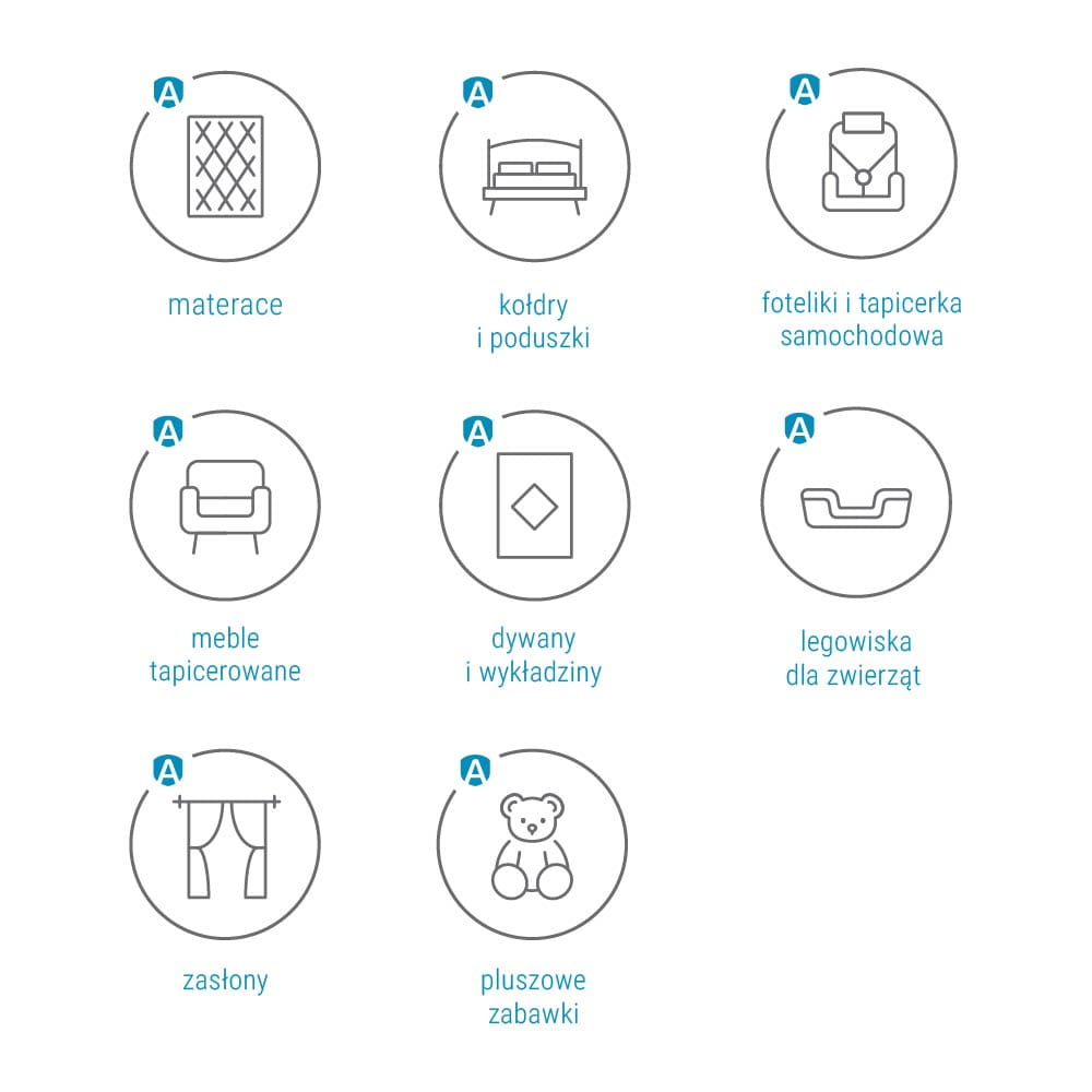 - Zalecany do opryskiwania miejsc o największym stężeniu alergenów kurzu domowego, m.in. materacy, miejsc do spania, mebli tapicerowanych, dywanów, pluszowych zabawek, tapicerki samochodowej.