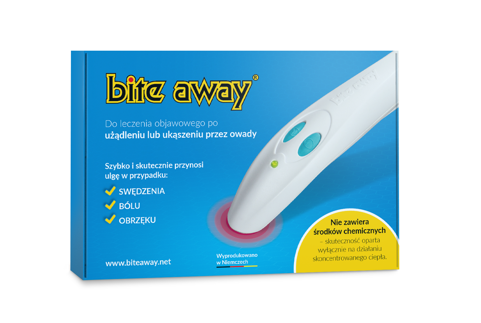 Oryginalne urządzenie na ukąszenia owadów. Już po jednej aplikacji w ciągu jednej minuty może długotrwale złagodzić swędzenie po ukąszeniach komarów. Bez smarowania i uciążliwych kremów, działanie pozbawione chemii. Zaprojektowany, opracowany i wyprodukowany w Niemczech.