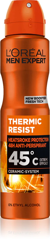 L’Oréal Men Expert Thermic Resist 48h to antyperspirant w sprayu stworzony z myślą o mężczyznach aktywnych, potrzebujących skutecznej ochrony przed potem i nieprzyjemnym zapachem nawet w wysokiej temperaturze. Produkt zapewnia długotrwałe działanie, które wspiera poczucie świeżości i komfortu przez cały dzień.
