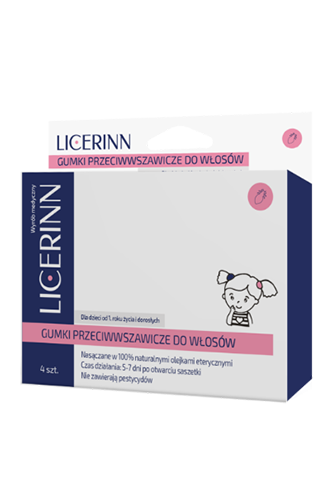 LICERINN Gumki przeciwwszawicze to wyrób medyczny przeznaczony do stosowania w profilaktyce wszawicy i chorób przenoszonych przez wszy. Gumki przeciwwszawicze LICERINN nasączone są w 100% naturalnymi olejkami. Nie zawierają pestycydów i są nietoksyczne. Dzięki olejkom eterycznym wyrób odstrasza wszy i gnidy. Stanowi ochronę skóry głowy zarówno dzieci, jak i osób dorosłych.
