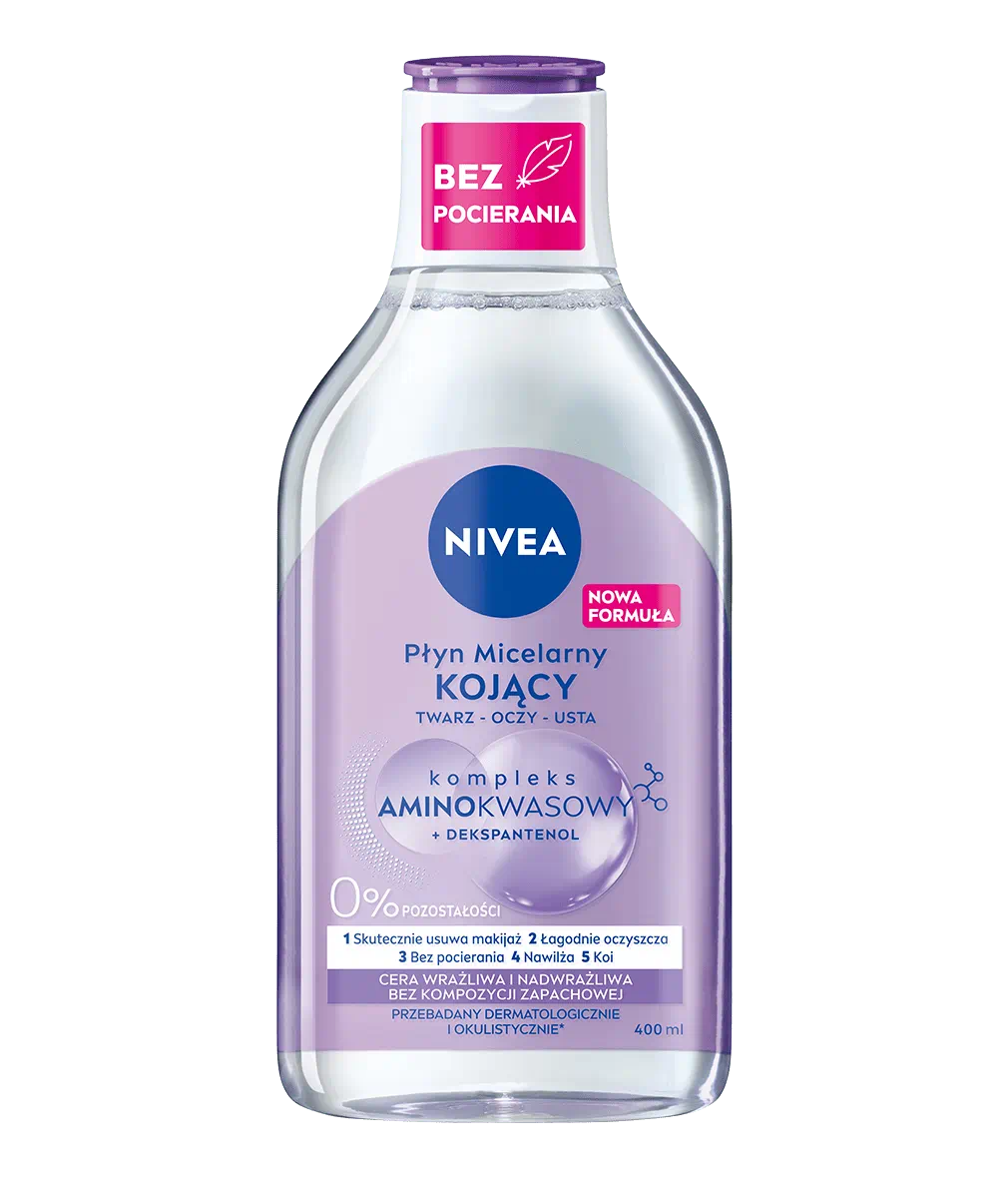 Kojący płyn micelarny NIVEA do skóry wrażliwej delikatnie oczyszcza, usuwa makijaż, nawilża i koi skórę bez pozostawiania śladów. Formuła z Kompleksem Aminokwasowym i Dekspantenolem skutecznie usuwa makijaż, zanieczyszczenia i brud za pomocą kilku lekkich pociągnięć, bez pocierania.