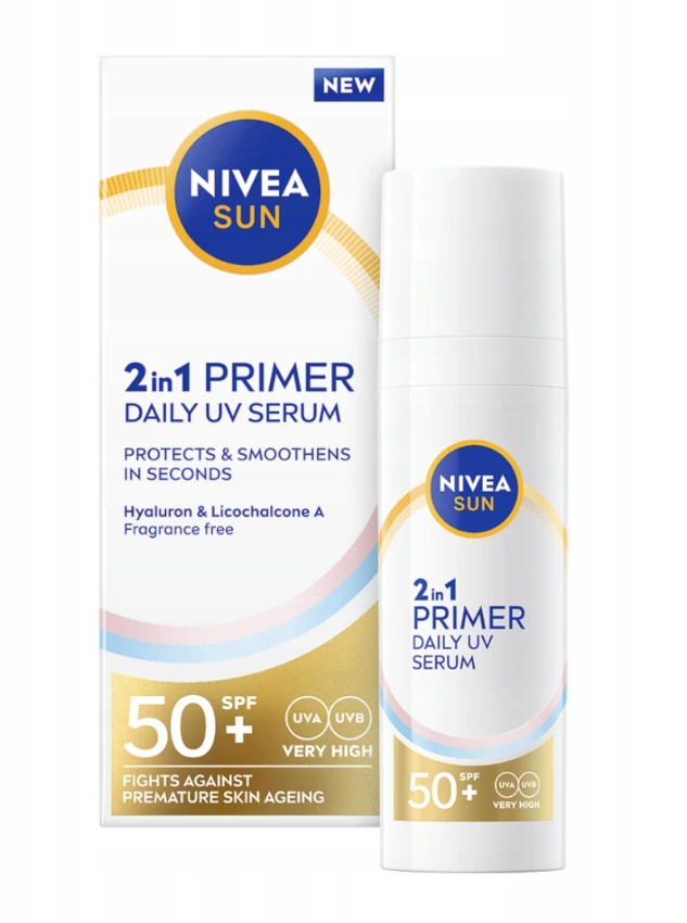 NIVEA SUN Primer 2w1 Daily UV Serum SPF50+ to lekkie serum ochronne do twarzy z bardzo wysokim filtrem przeciwsłonecznym. Produkt łączy działanie ochrony UV z funkcją bazy pod makijaż. Chroni skórę przed promieniowaniem UVA i UVB, a jednocześnie wygładza powierzchnię skóry i przygotowuje ją do aplikacji kosmetyków kolorowych. Lekka formuła szybko się wchłania, nie pozostawia białych śladów i nie obciąża skóry.