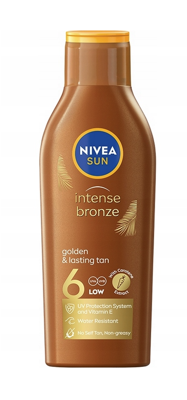 NIVEA SUN Intense Bronze Balsam do opalania SPF6 wspiera uzyskanie naturalnej, intensywnej opalenizny, jednocześnie zapewniając podstawową ochronę przed promieniowaniem słonecznym. Formuła została wzbogacona o ekstrakt z pro-melaniny, który wspiera naturalny proces opalania skóry. Balsam nawilża skórę, pomaga zapobiegać jej przesuszeniu podczas ekspozycji na słońce oraz pozostawia ją miękką i gładką.