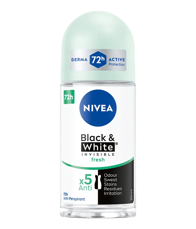 Wypróbuj antyperspirant w kulce NIVEA Black&White Invisible Fresh zapewniający ochronę przed białymi śladami na czarnych ubraniach i zapobiegający powstawaniu żółtych plam na białych ubraniach. Niezawodna, 72-godzinna ochrona antyperspirantu, która jednocześnie dba o Twoją skórę pod pachami. Produkt zapewnia pewną ochronę przed potem i nieprzyjemnym zapachem bez ryzyka pobrudzenia Twoich ulubionych ubrań. Formuła nie zawiera alkoholu etylowego, a jej tolerancja dla skóry została potwierdzona dermatologicznie. NIVEA Black & White - ochrona 5w1 przed nieprzyjemnym zapachem, potem, podrażnieniami, żółtymi plamami na białych ubraniach i białymi śladami na czarnych ubraniach. Wyjątkowa ochrona Derma Active Protection teraz z ochroną przez 72 godziny. Zaufaj najwyższej jakości kosmetyków marki NIVEA.