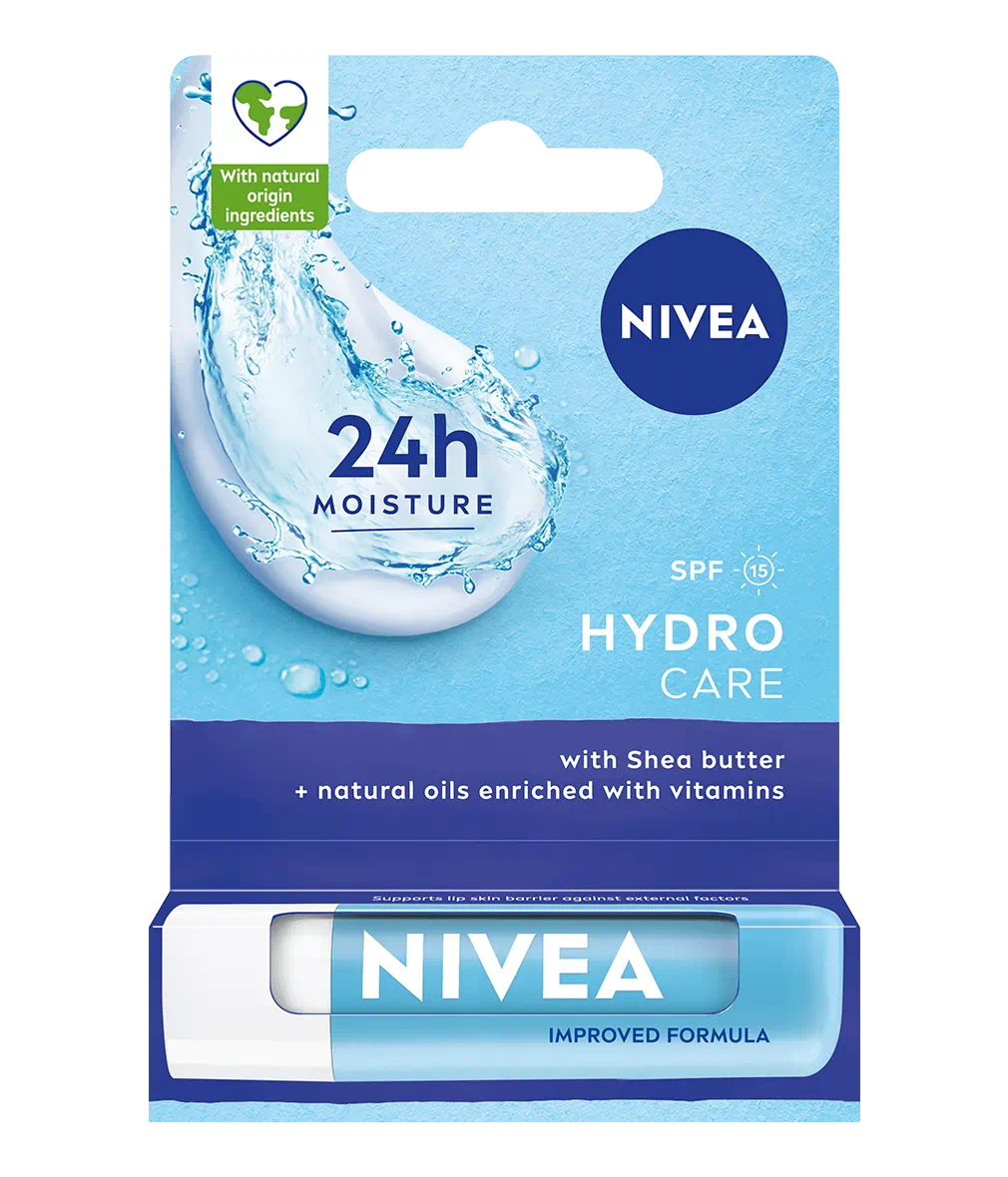 Nawilżająca pomadka do ust NIVEA Hydro Care to lekka formuła z naturalnymi olejkami i masłem shea, o przyjemnej i jedwabistej konsystencji. Pomadka nawilżająca natychmiast wtapia się w Twoje usta, zapewniając im 24-godzinne* nawilżenie oraz sprawiając, że usta są przyjemnie miękkie. Zawarty w formule filtr SPF 15 chroni przed szkodliwym wpływem promieni słonecznych, pomagając zapobiegać pierzchnięciu i wysuszeniu ust. Formuła ze składnikami pochodzenia naturalnego nie zawiera olejów mineralnych. Ciesz się przyjemnym uczuciem świeżości i naturalnie miękkimi ustami, dzięki pomadce NIVEA Hydro Care! Wygodna forma sztyftu sprawia, że możesz ją mieć zawsze przy sobie i dostarczyć ustom nawilżenia kiedy tylko go potrzebują. Tolerancja dla skóry potwierdzona dermatologicznie. *przebadana klinicznie