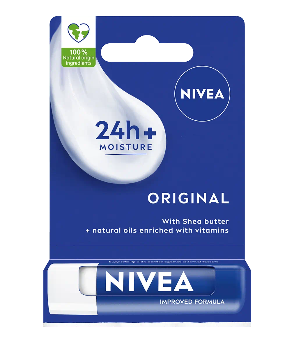 Zapewnij swoim ustom ochronę i nawilżenie! Ochronna pomadka NIVEA Original Care to wyjątkowo pielęgnująca formuła ze składnikami pochodzenia naturalnego, naturalnymi olejkami i masłem shea. Sprawia, że usta stają się niezwykle miękkie i nawilżone, a także zapewnia im ochronę przed wysychaniem. Przyjemna i jedwabista konsystencja pomadki ochronnej natychmiast wtapia się w Twoje usta, zapewniając im 24-godzinne* nawilżenie. Ciesz się zdrowo wyglądającymi i naturalnie miękkimi ustami przez cały dzień, niezależnie od pogody! Wygodna forma ochronnej pomadki w sztyfcie jest idealna do noszenia zawsze przy sobie - w kieszeni czy w torebce. Tolerancja dla skóry potwierdzona dermatologicznie. NIVEA® - ponad 100 lat doświadczenia w pielęgnacji skóry oraz starannie wyselekcjonowane składniki z zachowaniem najwyższych standardów jakości. *przebadana klinicznie