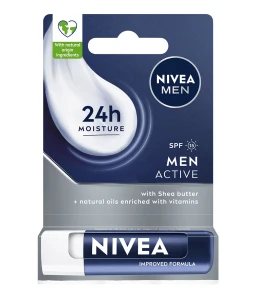 Zadbaj o swoje usta każdego dnia! Formuła pomadki dla mężczyzn NIVEA MEN Active natychmiast wtapia się w Twoje usta, zapewniając im 24-godzinne nawilżenie*. Pomadka NIVEA MEN ze składnikami pochodzenia naturalnego przynosi ukojenie oraz zapobiega suchym i spierzchniętym ustom u mężczyzny. Dodatkowo, filtr SPF 15 chroni wargi przed szkodliwym wpływem promieni słonecznych. Ciesz się długotrwałym nawilżeniem i ochroną ust w każdych warunkach dzięki męskiej pomadce do ust od NIVEA MEN! Formuła nie zawiera olejów mineralnych. Wygodna forma męskiej pomadki w sztyfcie sprawia, że możesz mieć ja zawsze przy sobie - w kieszeni lub plecaku! Tolerancja dla skóry potwierdzona dermatologicznie. NIVEA® - ponad 100 lat doświadczenia w pielęgnacji skóry oraz starannie wyselekcjonowane składniki z zachowaniem najwyższych standardów jakości. *przebadana klinicznie