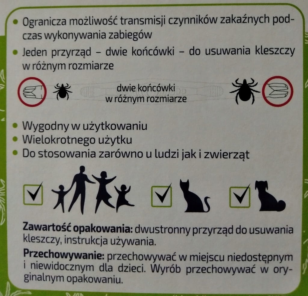 Jeden przyrząd - dwie końcówki - do usuwania kleszczy w różnym rozmiarze, Wygodny w użytkowaniu, Wielokrotnego użytku, Do stosowania zarówno u ludzi jak i zwierząt.