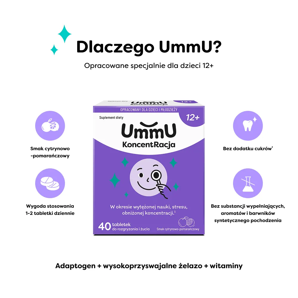 UmmU KoncentRacja 12+ to suplement diety w formie pastylek do rozgryzania i żucia o przyjemnym smaku cytrynowo-pomarańczowym, stworzony z myślą o dzieciach powyżej 12. roku życia. Produkt wspiera prawidłowe funkcjonowanie układu nerwowego, koncentrację i redukcję uczucia zmęczenia.